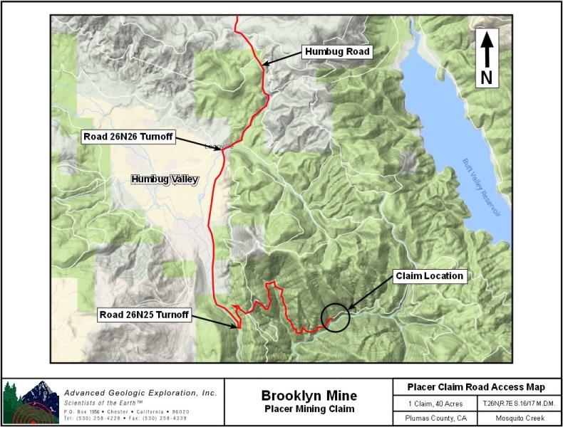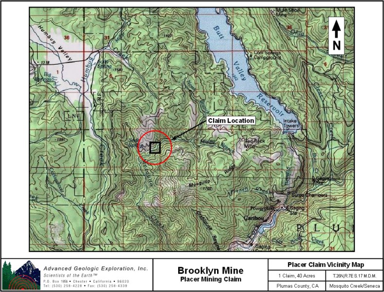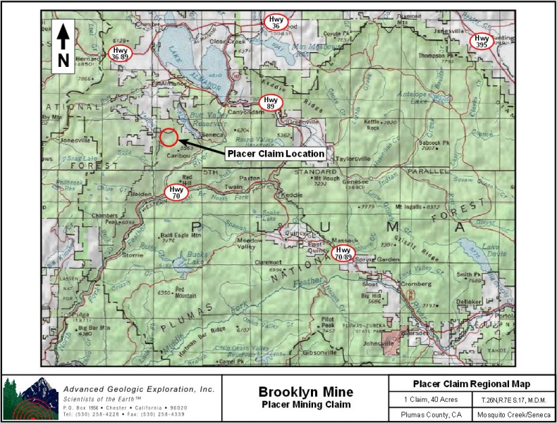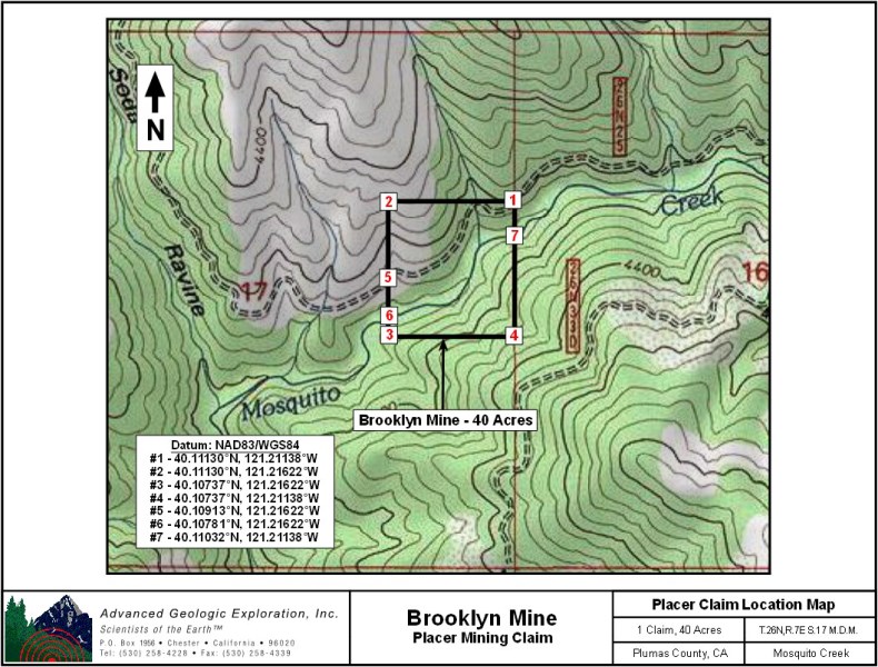 Standard Information The Brooklyn Mine placer mining claim is a non-patented federal mining claim. You will need to file appropriate annual paperwork to hold the property every year. (Ask us about our Filing Service to assist you with that!) Annual property tax assessment is approximately $1.12 an acre . Upon payment, the mineral claim will be transferred via a notarized Quitclaim notice filed in your name with Plumas County and the BLM. Limited payment terms and conditions are available; information available on request. Typical terms are some down payment and monthly payments till paid off in full. BLM Fees & Advanced Geologic Transfer Fees Advanced Geologic has an exceptional automatic claim notice filing system that will maintain your annual filings for any claim in the United States. Advanced Geologic reminds you that you MUST file annual notices with both the county in which the claim is located AND with the Bureau of Land Management by the appropriate dates. There are NO exceptions and errors will lead to the loss of your claim! Are your claims filed correctly? Advanced Geologic is a professional geologic consulting firm located in Chester, California. We not only sell quality mining claims, but we also help people work their claims. Our experience in resource evaluations, compliance and permitting and claim portfolio management allows our clients and buyers to go for the GOLD. Interested? Send us an email or call. . |