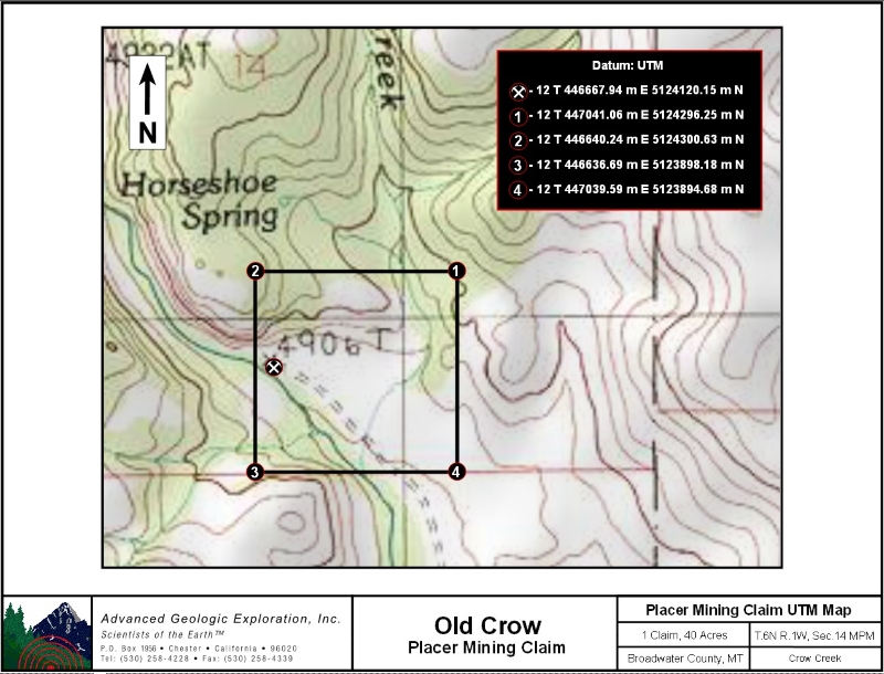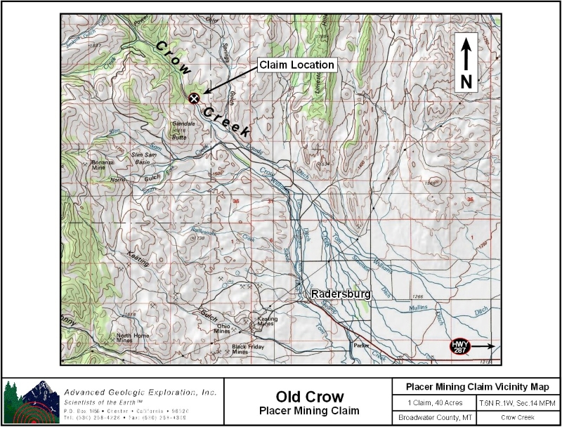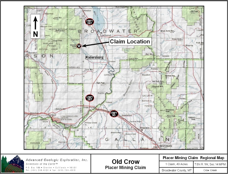 Standard Information The Old Crow placer mining claim is a non-patented federal mining claim. You will need to file appropriate annual paperwork to hold the property every year. (Ask us about our Filing Service to assist you with that!) Annual property tax assessment is approximately $1.12 an acre. BLM Fees & Advanced Geologic Transfer Fees Upon payment, the mineral claim will be transferred via a notarized Quitclaim notice filed in your name with Broadwater County and the BLM. Limited payment terms and conditions are available; information available on request. Advanced Geologic has an exceptional annual claim paperwork filing system that will maintain your annual filings for any claim in the United States. Advanced Geologic reminds you that you MUST file annual notices with both the county in which the claim is located AND with the Bureau of Land Management by the appropriate dates. There are NO exceptions and errors will lead to the loss of your claim! Are your claims filed correctly? Advanced Geologic is a professional geologic consulting firm located in Chester, California. We not only sell quality mining claims, but we also help people work their claims. Our experience in resource evaluations, compliance and permitting and claim portfolio management allows our clients and buyers to go for the GOLD. Interested? Send us an email or call. . |