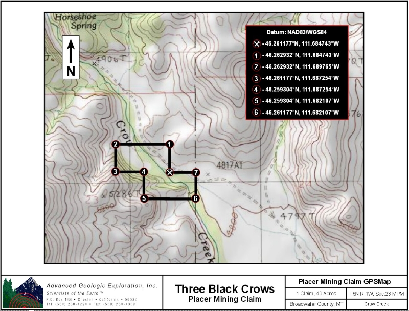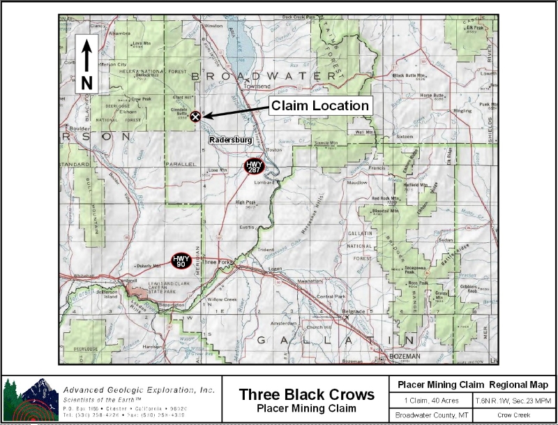 Standard Information The Three Black Crows placer mining claim is a non-patented federal mining claim. You will need to file appropriate annual paperwork to hold the property every year. (Ask us about our Filing Service to assist you with that!) Annual property tax assessment is approximately $1.12 an acre. BLM Fees & Advanced Geologic Transfer Fees Upon payment, the mineral claim will be transferred via a notarized Quitclaim notice filed in your name with Broadwater County and the BLM. Limited payment terms and conditions are available; information available on request. Advanced Geologic has an exceptional annual claim paperwork filing system that will maintain your annual filings for any claim in the United States. Advanced Geologic reminds you that you MUST file annual notices with both the county in which the claim is located AND with the Bureau of Land Management by the appropriate dates. There are NO exceptions and errors will lead to the loss of your claim! Are your claims filed correctly? Advanced Geologic is a professional geologic consulting firm located in Chester, California. We not only sell quality mining claims, but we also help people work their claims. Our experience in resource evaluations, compliance and permitting and claim portfolio management allows our clients and buyers to go for the GOLD. Interested? Send us an email or call. . |