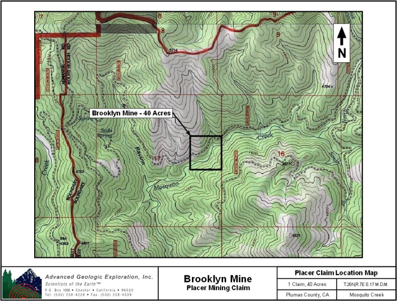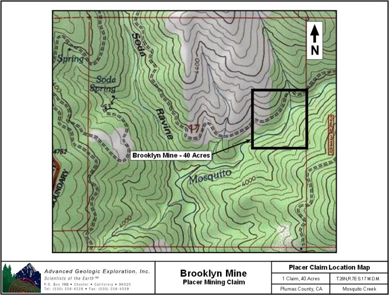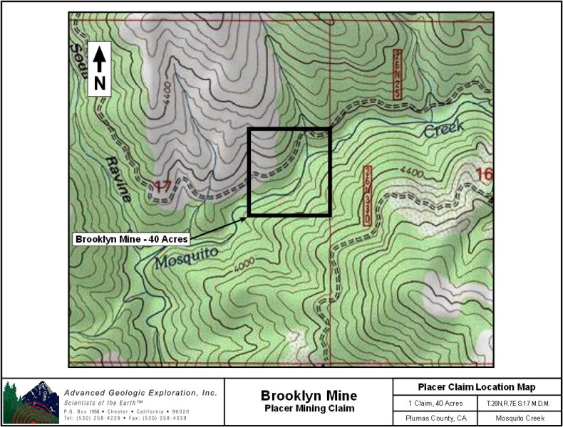 Standard Information The Brooklyn Mine placer mining claim is a non-patented federal mining claim. You will need to file appropriate annual paperwork to hold the property every year. (Ask us about our Filing Service to assist you with that!) Annual property tax assessment is approximately $1.12 an acre . Upon payment, the mineral claim will be transferred via a notarized Quitclaim notice filed in your name with Plumas County and the BLM. Limited payment terms and conditions are available; information available on request. Typical terms are some down payment and monthly payments till paid off in full. BLM Fees & Advanced Geologic Transfer Fees Advanced Geologic has an exceptional automatic claim notice filing system that will maintain your annual filings for any claim in the United States. Advanced Geologic reminds you that you MUST file annual notices with both the county in which the claim is located AND with the Bureau of Land Management by the appropriate dates. There are NO exceptions and errors will lead to the loss of your claim! Are your claims filed correctly? Advanced Geologic is a professional geologic consulting firm located in Chester, California. We not only sell quality mining claims, but we also help people work their claims. Our experience in resource evaluations, compliance and permitting and claim portfolio management allows our clients and buyers to go for the GOLD. Interested? Send us an email or call. . |