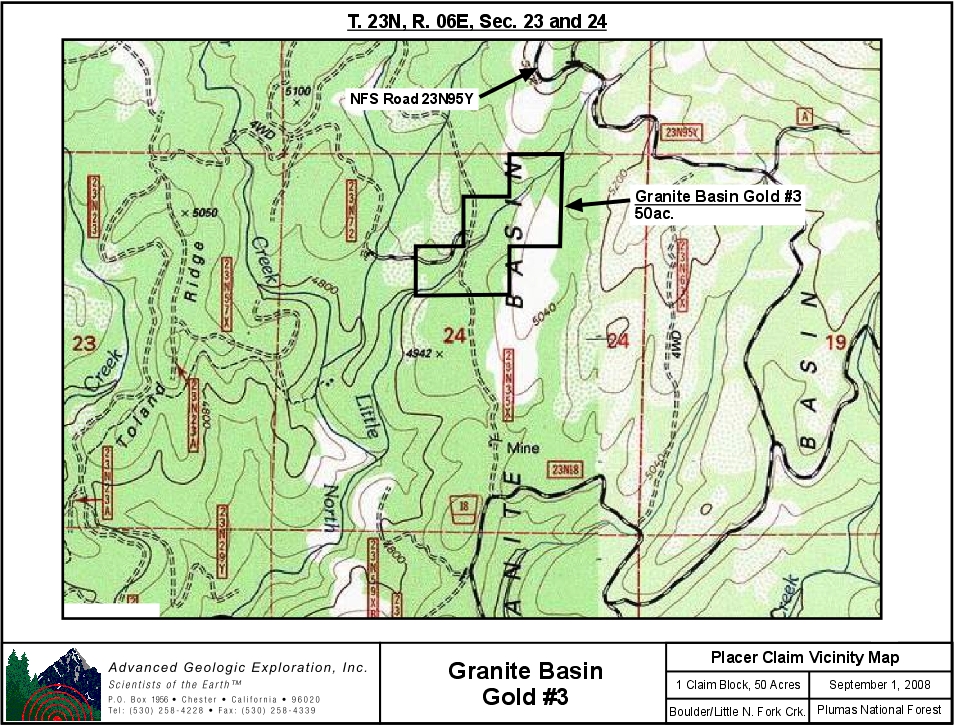 Granite Basin Gold #3 ±50 Acres BLM CAMC #293916 Price: $5,500 Granite Basin is one of the most beautiful places in the Northern Sierra. Lush forests, sparkling creeks and the salt and pepper granite outcrops that are legendary. Little North Fork Middle Fork Feather River is one of the main creeks that drains the Tertiary gravel deposits that cap the mountains of the area. The gold is bright and there is plenty of it! Our Granite Basin Gold #3 placer mining claim secures a long section of the drainage just down from the Tertiary gravel outcrops. The attributes of the claim are: