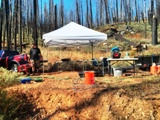 The West Branch of Lights Creek has some amazing mining history. Being located well up valley from the "canyon", few would think that this area would have good gold potential. But don't let that fool you because these claims are closer to the source of the gold - the famous and auriferous Tertiary Jura paleochannel deposit! The Jura deposit's type location is on the north flank of Mount Jura, which is a few miles north of Taylorsville, and remnant patches of the gravel deposit crop out on several of the surrounding ridges and mountain tops. One of the largest outcrops is on Moonlight Ridge and extends both to the northeast and into the West Branch of Lights Creek drainage as well as to the northwest into Mountain Meadows and beyond. Larry Gardside, a research geologist at University Nevada, Reno, dated the Jura Deposits as Eocene (33-56 million years) in age. (see reference). He also has great descriptions of this and other paleochannels in this part of the world. The Jura deposit in the West Branch crops out on the Four Kings claim and the two small drainages erode the gravels into the West Branch creek. Historic placer workings of the creek extend both up and down valley, some of which were very large hydraulic operations. Be sure to look at these when you scout out the claim. There are also remnant West Branch creek terrace deposits not only adjacent to the creek, but high on the ridges too. Some of these were hydraulically worked as well. While the Jura deposit has gold, the big score on this claim are the remnant terrace deposits, especially one adjacent to the creek on north side at the mouth of the two small drainages. An alluvial fan has developed on a remnant terrace that is loaded with gold. We have tested this gravel bench and recovered 2.6 grams of gold in four 1/2-filled 5-gallon buckets. Exactly where were our tests? Well, you will have to call to find out. Nevertheless, the way to effectively mine this claim is with a small trommel and backhoe. The deposit is only 4-7 feet thick, but it covers the entire broad bench that likely has many, many tens of ounces if not pounds of gold. Of course, the key here is the gravel-bedrock contact. Here the bedrock is a volcanic ash (tuff) that is soft and easily dug with a backhoe. We discovered pockets and kettles that were carved out when the creek flowed on this terrace at some earlier time. Given our little score from just four 1/2-filled 5-gallon buckets, we feel this to be one of our best scores in our claim portfolio. It is small, but perfect for the single guy or Dad-son team that want to not just prospect but get a fair amount of gold too. In addition, this area was intensely burned in the Moon Light Fire of 2006. There are not a lot of trees and the Whitethorne bushes have thoroughly taken over, but this is a good thing. There are no significant environmental issues here to prevent you from getting a permit to mine the area! The Forest Service would gladly approve your permit here. It is important to give the Forest Service 60-120 days to approve your permit - yes, they are slow so give yourself time to get your permit before you go mining. The creek is seasonal and will dry up in the later summer months. So the time to mine is early spring to early summer. Neighboring claimants are friendly and you may find them eager to help you with your prospecting activities while you share their beer. This will be a fun place to mine! Great views, great times, great gold! P.S. You may want to come in from the Westwood-Mountain Meadows side rather than the Indian Valley side. Check that out on our Google Maps. Some of the amenities are: