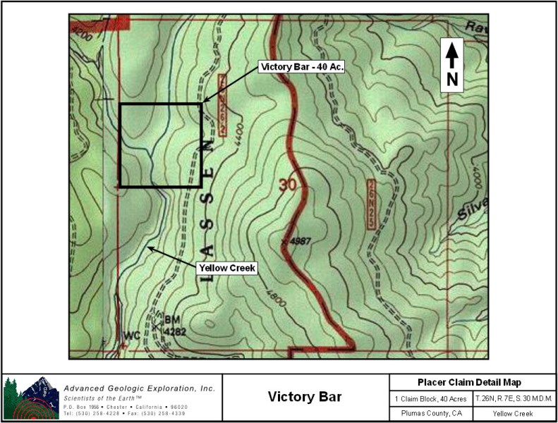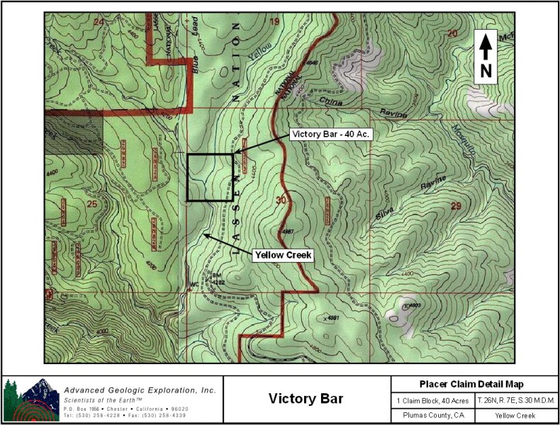 Click here Google Earth Fly To and see an aerial photo of the Victory Bar and the claim boundaries. Click here to Google Map it. Estimated GPS Coordinates: