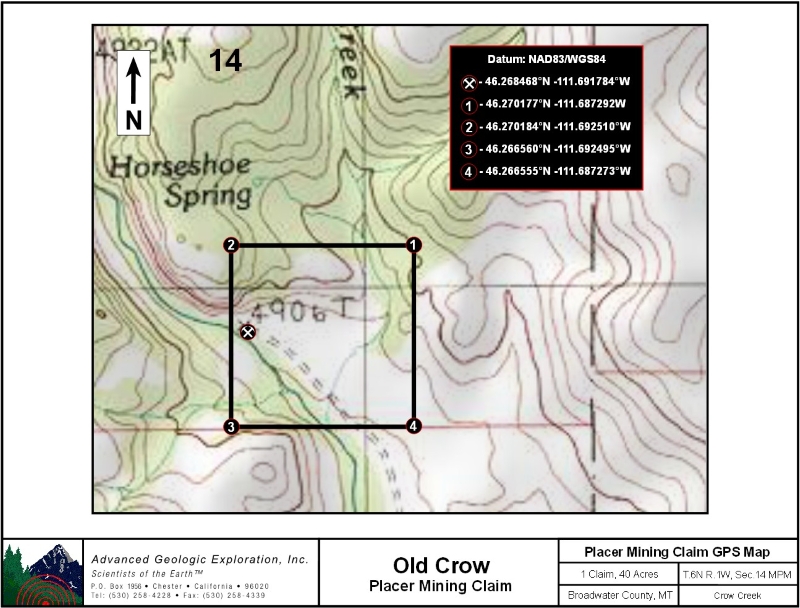 Standard Information The Old Crow placer mining claim is a non-patented federal mining claim. You will need to file appropriate annual paperwork to hold the property every year. (Ask us about our Filing Service to assist you with that!) Annual property tax assessment is approximately $1.12 an acre. BLM Fees & Advanced Geologic Transfer Fees Upon payment, the mineral claim will be transferred via a notarized Quitclaim notice filed in your name with Broadwater County and the BLM. Limited payment terms and conditions are available; information available on request. Advanced Geologic has an exceptional annual claim paperwork filing system that will maintain your annual filings for any claim in the United States. Advanced Geologic reminds you that you MUST file annual notices with both the county in which the claim is located AND with the Bureau of Land Management by the appropriate dates. There are NO exceptions and errors will lead to the loss of your claim! Are your claims filed correctly? Advanced Geologic is a professional geologic consulting firm located in Chester, California. We not only sell quality mining claims, but we also help people work their claims. Our experience in resource evaluations, compliance and permitting and claim portfolio management allows our clients and buyers to go for the GOLD. Interested? Send us an email or call. . |