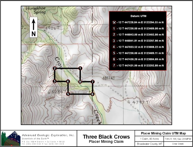 Standard Information The Three Black Crows placer mining claim is a non-patented federal mining claim. You will need to file appropriate annual paperwork to hold the property every year. (Ask us about our Filing Service to assist you with that!) Annual property tax assessment is approximately $1.12 an acre. BLM Fees & Advanced Geologic Transfer Fees Upon payment, the mineral claim will be transferred via a notarized Quitclaim notice filed in your name with Broadwater County and the BLM. Limited payment terms and conditions are available; information available on request. Advanced Geologic has an exceptional annual claim paperwork filing system that will maintain your annual filings for any claim in the United States. Advanced Geologic reminds you that you MUST file annual notices with both the county in which the claim is located AND with the Bureau of Land Management by the appropriate dates. There are NO exceptions and errors will lead to the loss of your claim! Are your claims filed correctly? Advanced Geologic is a professional geologic consulting firm located in Chester, California. We not only sell quality mining claims, but we also help people work their claims. Our experience in resource evaluations, compliance and permitting and claim portfolio management allows our clients and buyers to go for the GOLD. Interested? Send us an email or call. . |