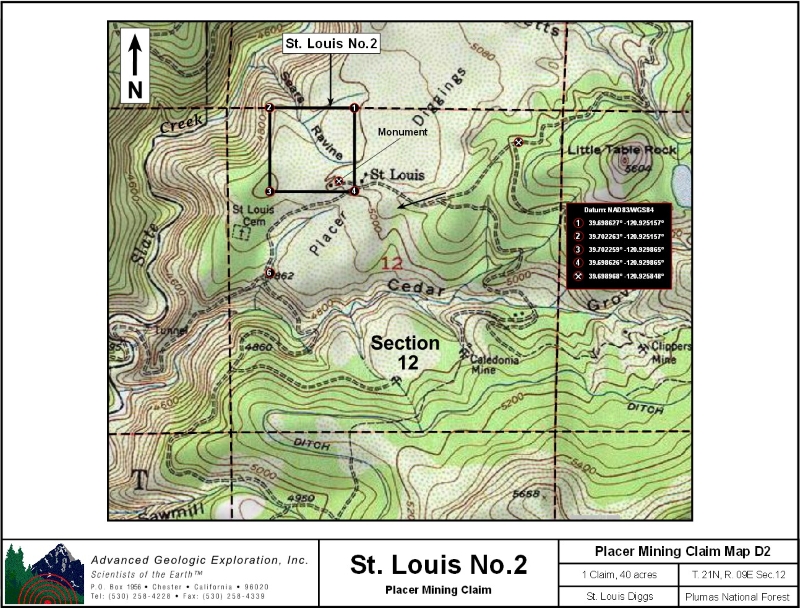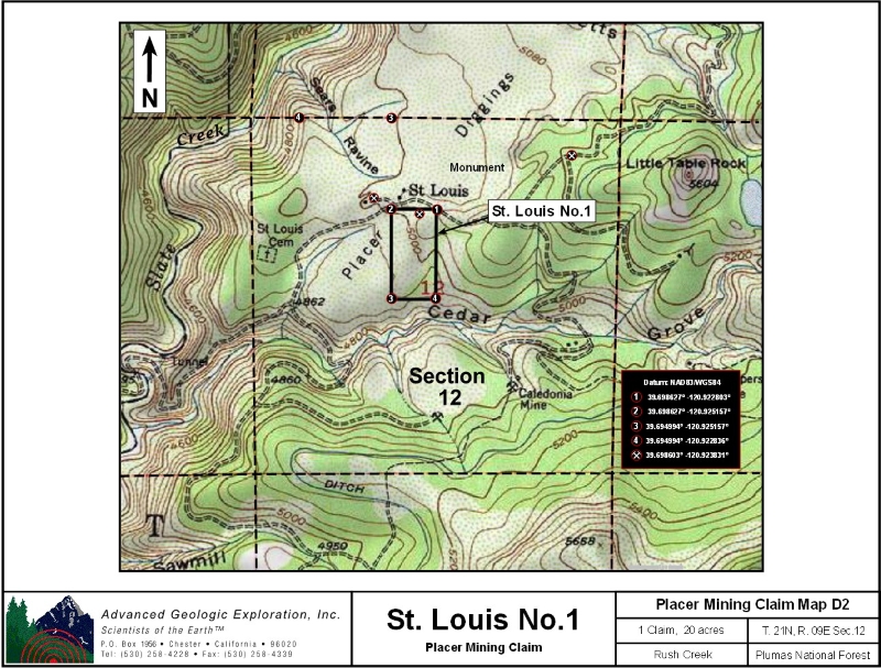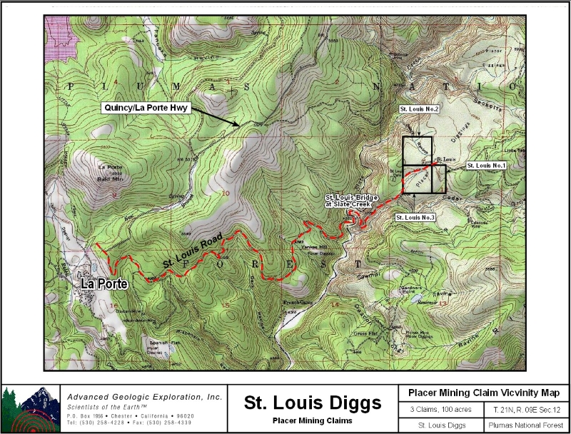 Our St. Louis No.1, No.2, & No.3 are located in the Port Wine gold district, which lies about 10 miles northwest of Downieville. Geology: The Port Wine channel, a major branch of the La Porte channel, extends southwest through this area. It is roughly parallel to the La Porte channel for some miles and joins it at Scales. The channel is well-defined and several hundred feet wide. The gravels are quartz-rich and in places are covered by "pipe" clay and andesite. Bedrock is slate, quartzite, amphibolite, and greenstone. Work Cited: “Gold Districts of Click here Google Earth Fly To and see an aerial photo of St. Louis No.1, No.2, & No.3 and the claim boundaries. Google map it for directions to claim. Standard Information The St. Louis No. 1, No.2, & No.3 placer mining claims are non-patented federal mining claims. You will need to file appropriate annual paperwork to hold the property every year. (Ask us about our Filing Service to assist you with that!) Annual property tax assessment is approximately $1.12 an acre . BLM Fees & Advanced Geologic Transfer Fees Upon payment, the mineral claim will be transferred via a notarized Quitclaim notice filed in your name with Sierra County and the BLM. Limited payment terms and conditions are available; information available on request. Advanced Geologic has an exceptional annual claim paperwork filing system that will maintain your annual filings for any claim in the United States. Advanced Geologic reminds you that you MUST file annual notices with both the county in which the claim is located AND with the Bureau of Land Management by the appropriate dates. There are NO exceptions and errors will lead to the loss of your claim! Are your claims filed correctly? Advanced Geologic is a professional geologic consulting firm located in Chester, California. We not only sell quality mining claims, but we also help people work their claims. Our experience in resource evaluations, compliance and permitting and claim portfolio management allows our clients and buyers to go for the GOLD. Interested? Send us an email or call. \ |