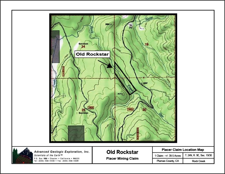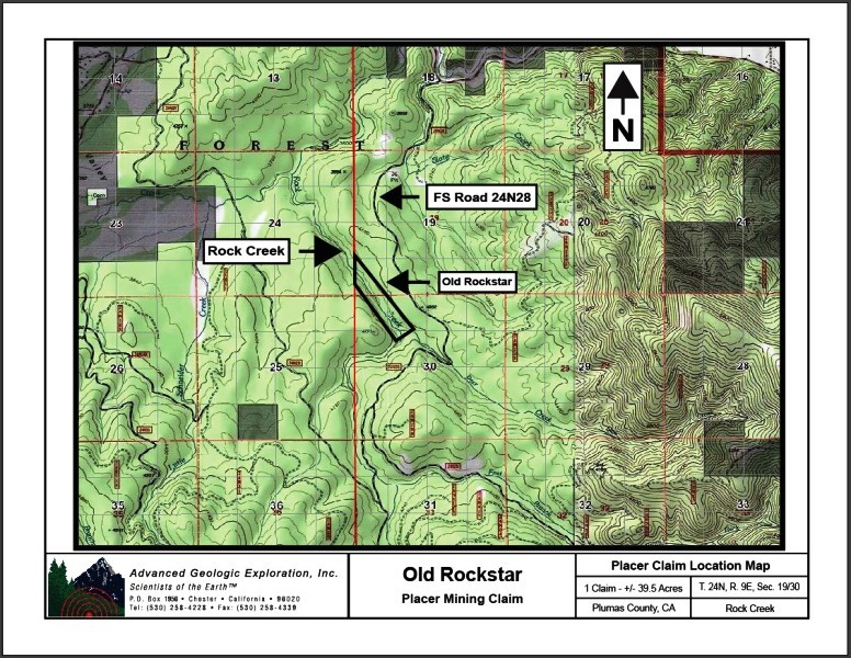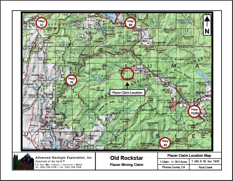 Click Google Earth Fly To to see an ariel view of the Old Rockstar placer claim and its boundaries. Click here to Google Map it. Standard Information BLM Fees & Advanced Geologic Transfer Fees Upon payment, the mineral claim will be transferred via a notarized Quitclaim notice filed in your name with Plumas County and the BLM. Limited payment terms and conditions are available; information available on request. Advanced Geologic has an exceptional automatic claim notice filing system that will maintain your annual filings for any claim in the United States. Advanced Geologic reminds you that you MUST file annual notices with both the county in which the claim is located AND with the Bureau of Land Management by the appropriate dates. There are NO exceptions and errors will lead to the loss of your claim! Are your claims filed correctly? Advanced Geologic is a professional geologic consulting firm located in Chester, California. We not only sell quality mining claims, but we also help people work their claims. Our experience in resource evaluations, compliance and permitting and claim portfolio management allows our clients and buyers to go for the GOLD. Interested? Send us an email or call. New 2024 Spring Pictures! |