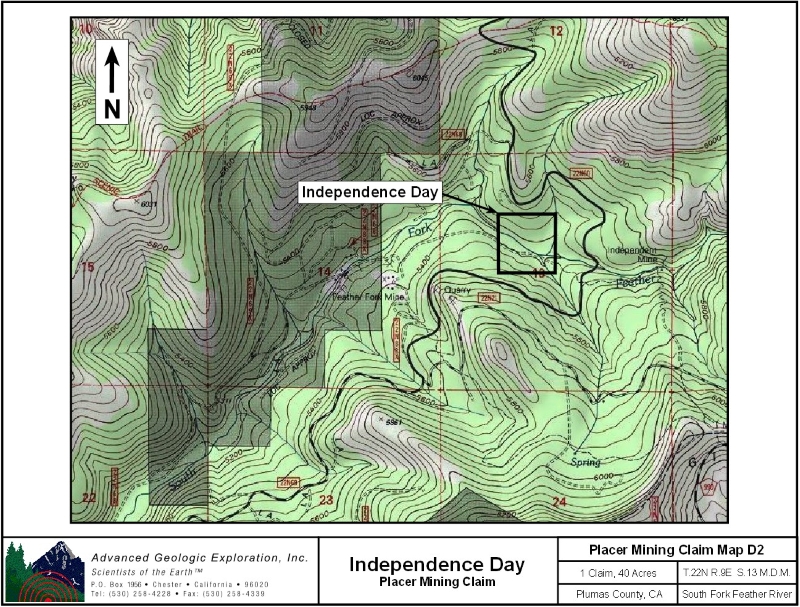 Independence Day ±40 Acres Price: $12,000 A HUGE acquisition added to the Advanced Geologic portfolio, the Independence Day claim site was once held by a former claim owner since 1911! With the price of gold at an all time high this spectacular claim won't last long, don't miss your opportunity to own this premier gold mine!