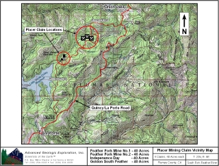 Standard Information The Independence Day placer mining claim is a non-patented federal mining claim. You will need to file appropriate annual paperwork to hold the property every year. (Ask us about our Filing Service to assist you with that!) Annual property tax assessment is approximately $1.12 an acre. BLM Fees & Advanced Geologic Transfer Fees Upon payment, the mineral claim will be transferred via a notarized Quitclaim notice filed in your name with Plumas County and the BLM. Limited payment terms and conditions are available; information available on request. Advanced Geologic has an exceptional annual claim paperwork filing system that will maintain your annual filings for any claim in the United States. Advanced Geologic reminds you that you MUST file annual notices with both the county in which the claim is located AND with the Bureau of Land Management by the appropriate dates. There are NO exceptions and errors will lead to the loss of your claim! Are your claims filed correctly? Advanced Geologic is a professional geologic consulting firm located in Chester, California. We not only sell quality mining claims, but we also help people work their claims. Our experience in resource evaluations, compliance and permitting and claim portfolio management allows our clients and buyers to go for the GOLD. Interested? Send us an email or call. |